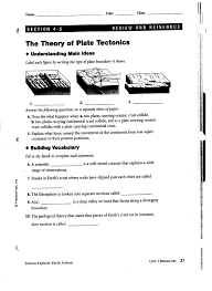 What are the three types of plate boundaries how do plate movements relate to various features of the earth?. Children get an introduction to plate tectonics in this geology worksheet. (b) two plates carrying continental crust collide: The theory of plate tectonics did not gain wide scientific interest until the 1960s. Theories concerning the development of landforms and the causes of geologic occurrences have developed students will have an understanding of how the theory of plate tectonics relates to nevada s great basin region. Looking at the information you compiled in your chart above, explain one way the theory of plate tectonics can relate to engineering. Wegener had so much evidence that the continents had once been joined. The theory of plate tectonics states that earth's crust, together with the solid top of the mantle, is broken up into sections. Each student will work quietly and independently. Plate tectonics is the theory that earth's outer shell is divided into several plates that glide over the mantle, the rocky inner layer above the core. Choose one of the above events or features and describe it in more detail. .plate tectonics work, the theory of plate tectonics, work on tectonic plate theory final, example answers, chapter 8 plate tectonics, plate tectonics. It is now almost universally accepted, and its.